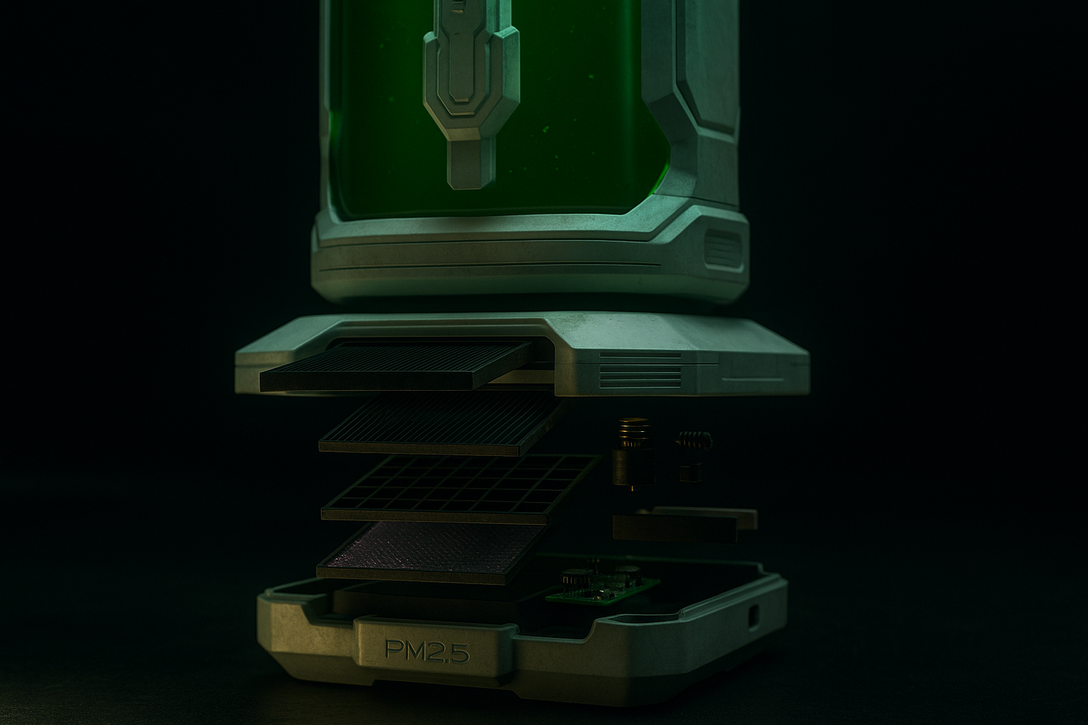 Calculated flow rates pull local air through pre‑mesh, HEPA, and activated carbon before contact with the bio‑reactor—capturing PM₂.₅/PM₁₀ and chemical pollutants.